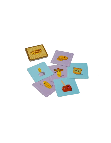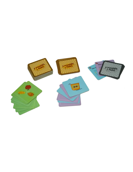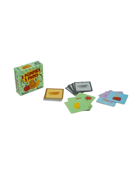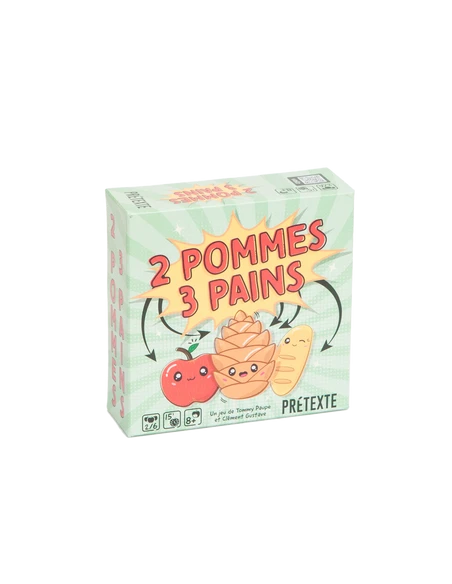 2 Pommes 3 Pains est un jeu d’annonce malin et divertissant qui met vos compétences d’observation à l’épreuve. Les joueurs tirent des cartes à tour de rôle, annonçant le nombre de Pommes et de Pains présents. Mais méfiez-vous de la Pomme de (deux) pins qui ajoute un défi supplémentaire !