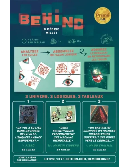 Behind est un jeu d’ambiance unique qui mêle logique, déduction et assemblage de tuiles pour créer une expérience immersive. Plongez dans 3 scénarios distincts où chaque tableau propose une mécanique et un univers uniques à résoudre en solo ou en coopération.
