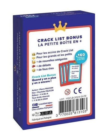 Découvrez Crack List + Bonus 1, le jeu de cartes d’ambiance qui réinvente le petit bac avec plus de 160 nouvelles catégories absurdes, fantaisistes, polémiques et poétiques ! Avec l’ajout de Bonus 1, la première extension, préparez-vous à des parties encore plus surprenantes et hilarantes. Fini les catégories classiques, Crack List revisite le concept pour offrir une expérience inédite en famille ou entre amis. Si vous aimez les challenges, les coups bas et les retournements de situation, Crack List est fait pour vous ! Utilisez différentes cartes pénalités et actions pour déstabiliser vos adversaires. Parfait pour des moments détendus en afterwork, réunion de famille, entre voisins ou à l’apéro, Crack List est le jeu de cartes idéal avec plusieurs manches où le premier à se débarrasser de toutes ses cartes remporte la manche !
