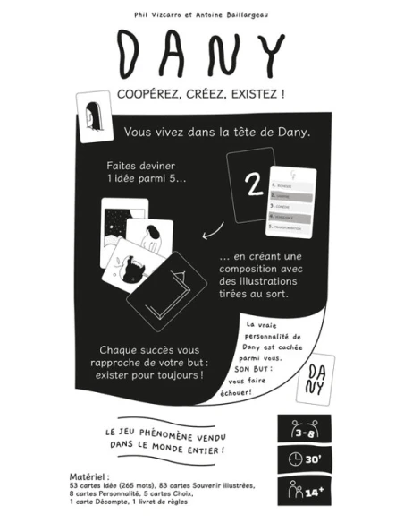 « Dany » est un jeu de société captivant où les joueurs explorent l’esprit complexe de Dany et tentent de démasquer sa véritable personnalité. Incarnez les différentes personnalités de Dany et utilisez vos souvenirs pour communiquer entre vous. Mais attention, Dany fera tout pour vous faire échouer et préserver son secret.