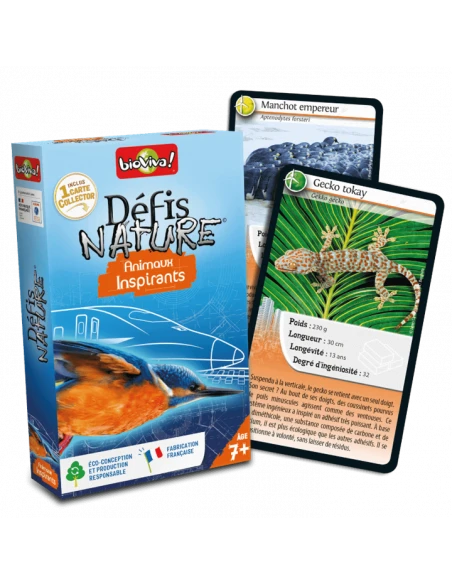 Le plus de ce Défis Nature : ce jeu contient un dépliant présentant les innovations inspirées des animaux présents dans ce Défis Nature. À titre d’exemple, la structure du bec du toucan toco a inspiré une bouilloire économe en énergie. La technique du papillon morpho pour réguler sa température a permis de développer un vernis préservant les panneaux solaires de la surchauffe.