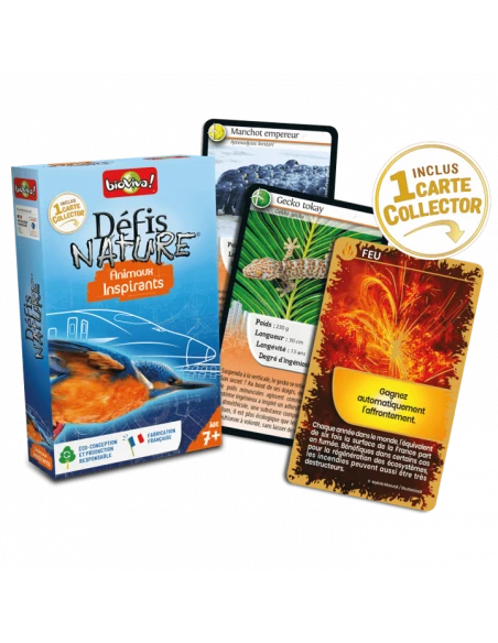 Une carte Collector aléatoire est incluse dans le jeu de cartes Défis Nature – Animaux inspirants. Elle permet aux joueurs de découvrir un phénomène naturel (ex : Feu, Arc-en-ciel, Tornade, Éclipse, Grêle, Aurore Polaire…) et entraîne une action spécifique sur la manche. 18 cartes Collector sont disponibles, il est possible de se procurer les cartes Collector Défis Nature sur notre site internet !