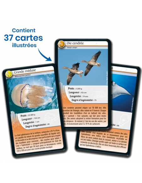 Chaque carte Défis Nature – Animaux inspirants est illustrée d’une photographie de l’animal dans son environnement naturel, de ses caractéristiques (« poids », « longueur », « longévité », « degré d’ingéniosité ») et contient du contenu éducatif pour en savoir plus sur l’espèce. Parfait pour apprendre en s’amusant !