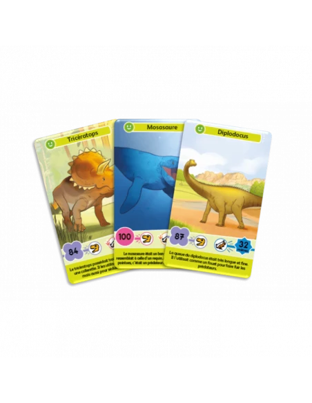 Les caractéristiques des dinosaures sont représentées par des petits dessins, rendant ainsi les cartes accessibles aux plus jeunes !