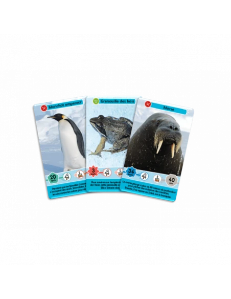 Le principe de Défis Nature Junior – Royaumes du froid est simple : les enfants, à partir de 5 ans, parient sur la vitesse ou la longévité des animaux. Celui qui possède la plus forte caractéristique remporte les cartes des autres joueurs. Le joueur ayant collectionné le plus de cartes à la fin de la partie, l’emporte.