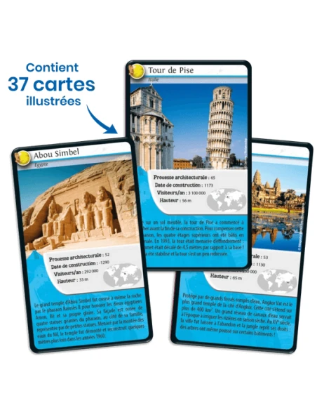 Le principe du jeu est simple et adapté aux enfants à partir de 7 ans. Chaque joueur parie sur les points forts des monuments représentés sur les cartes. Chaque carte présente un monument avec ses caractéristiques spécifiques telles que la hauteur, l’âge, l’architecture, etc. Les joueurs doivent choisir la caractéristique qu’ils estiment être la plus forte et parier dessus. Le joueur qui possède la caractéristique la plus élevée remporte les cartes des autres joueurs.