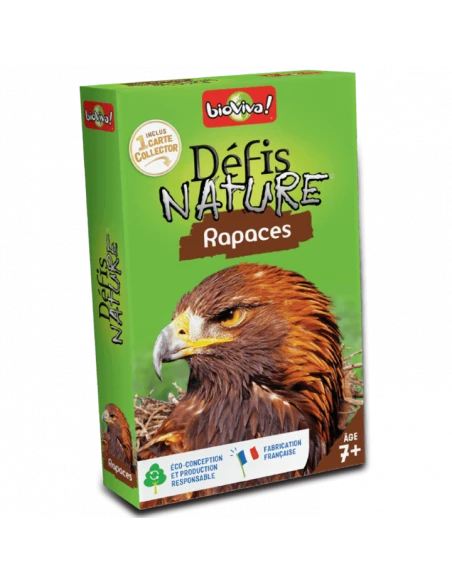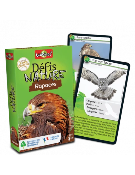 Le principe de Défis Nature – Rapaces est simple : les enfants de 7 ans et + parient sur les points forts des rapaces. Le joueur qui possède la plus forte caractéristique remporte les cartes des autres joueurs. Le premier à collecter toutes les cartes du jeu gagne la partie.