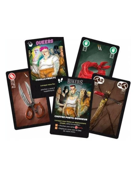 Dans cette prison, même les armes sont improvisées. Vous devrez être prêt à vous défendre en utilisant des armes que vous aurez vous-même fabriquées ou achetées avec des cigarettes. Le bluff et la mémoire sont de rigueur pour faire face aux cartes que les autres joueurs détiennent. Qui a des outils pour creuser ? Qui a des armes pour se battre ? Les cartes peuvent être retournées à tout moment, alors restez vigilant !