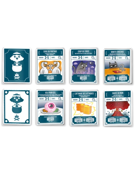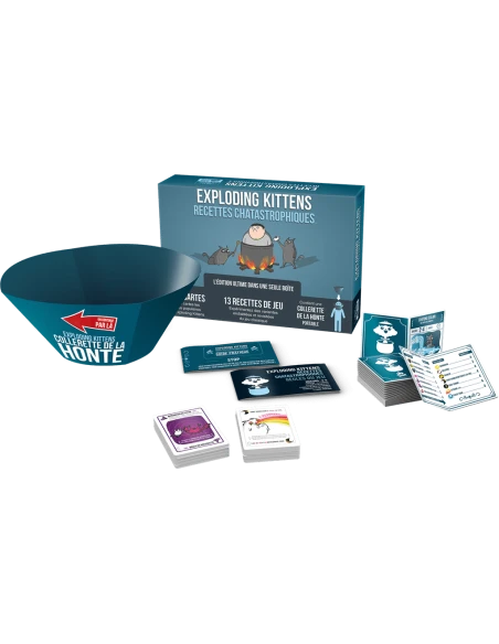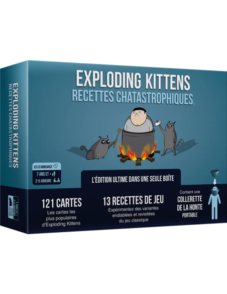 Recettes Chatastrophiques est une collection complète pour tous les niveaux de joueurs, des débutants aux experts. Les débutants trouveront tout ce dont ils ont besoin pour leur première partie d’Exploding Kittens, tandis que les joueurs confirmés y découvriront les meilleures cartes des extensions, ainsi que les Livrets de Recette qui offrent une douzaine de modes de jeu inédits. Cette collection est composée de 13 livrets de Recette, 5 livrets de Recette vierges, 121 cartes, 1 livret de règles, 1 guide pratique et la célèbre collerette de la honte.