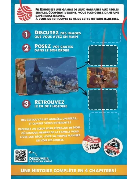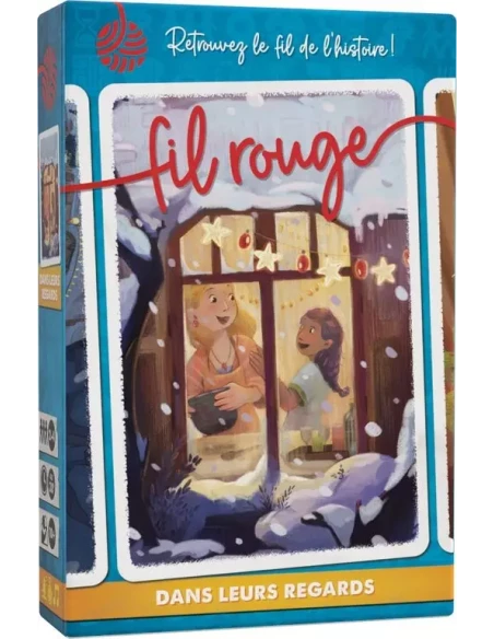 Dans Fil Rouge : Dans leurs Regards, vous explorez un réveillon de Noël où chaque membre de la famille partage sa propre version des événements. À travers une coopération entre les joueurs, vous devrez reconstituer un récit visuel en quatre chapitres à l’aide de cartes illustrées. Mais attention, communication et déduction seront vos meilleurs alliés pour relier les morceaux de l’histoire sans révéler vos cartes aux autres participants.