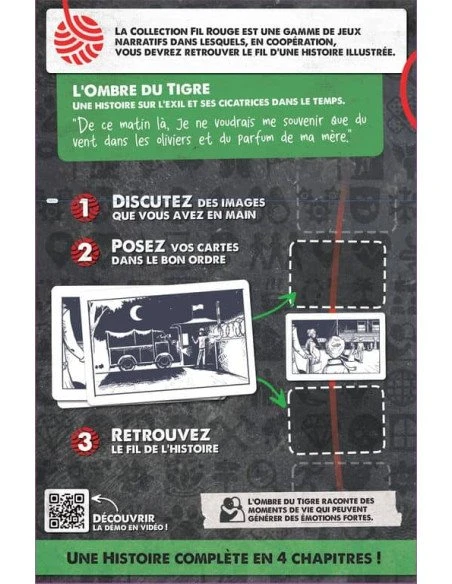 Fil Rouge : L’Ombre du Tigre est un jeu coopératif et narratif où les joueurs doivent retrouver le fil de l’histoire et remettre en ordre, dans une frise, les cartes qui leur ont été distribuées. À chaque chapitre, observez vos cartes sans les montrer aux autres joueurs. Partagez, racontez et décrivez ce que vous voyez pour aider à reconstituer l’ordre de l’histoire.