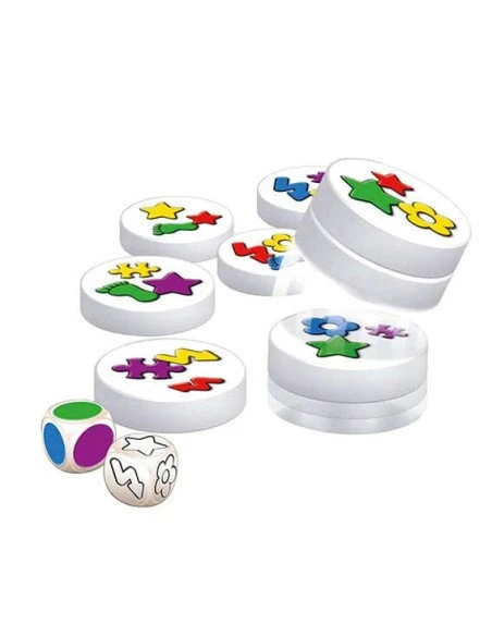 Contenu : 32 disques magnétiques, 1 dé Symbole, 1 dé Couleur, Règle du jeu