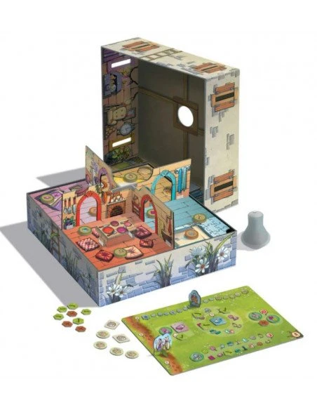 Contenu : 1 boîte maison, 10 jetons en bois, 2 pions, 38 jetons en carton, 1 plateau en 3D, 2 plateaux questions, 1 lampe