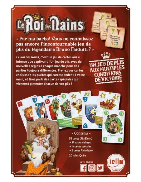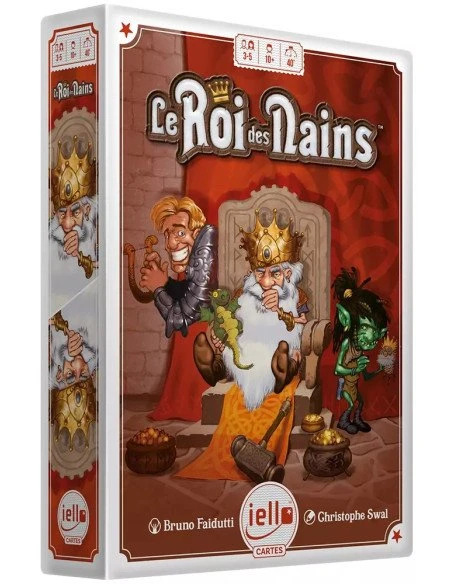 Dans Le Roi des Nains, humains, gobelins et nains s’affrontent dans des parties de cartes hilarantes et stratégiques. Inspiré du traditionnel jeu du Barbu, ce jeu de plis intègre des règles simples mais propose une touche de renouveau avec des quêtes et des cartes spéciales. Chaque manche vous propose de nouvelles conditions de victoire, obligeant les joueurs à adapter leur stratégie. À chaque tour, le but est non seulement de remporter des plis pour gagner des points, mais aussi d’en faire perdre à ses adversaires grâce aux cartes spéciales et aux défis variés. Entre alliances temporaires et coups bas, vous devrez faire preuve d’audace et d’anticipation pour devenir le prochain Roi des Nains.