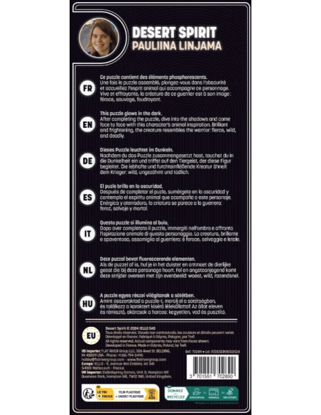 Découvrez des expériences de puzzles décalées avec « Puzzle PHOSPHO : Desert Spirit », un défi captivant qui mettra votre imagination à l’épreuve. Ce puzzle unique joue subtilement sur le décalage entre l’illustration de la boîte et la réalité du puzzle final. Une fois assemblé, ce puzzle révèle des éléments phosphorescents qui s’illuminent dans l’obscurité, dévoilant l’esprit animal féroce et sauvage du guerrier qui l’accompagne.