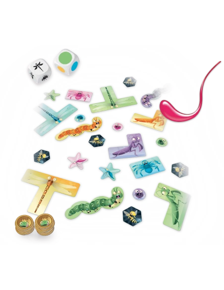 Sticky Chameleons est un jeu d’adresse et de rapidité qui plaira aussi bien aux grands qu’aux petits. Les joueurs incarnent des caméléons affamés, prêts à tout pour attraper leur proie. À chaque tour, lancez les dés pour découvrir le type d’insecte à attraper et sa couleur. Puis, en même temps, lancez votre langue à l’assaut de l’insecte en question et soyez le premier à l’attraper. Mais attention, vous devrez éviter d’emmêler votre langue avec celles des autres caméléons et de vous faire piquer par une guêpe. Le premier joueur à attraper 5 insectes est déclaré vainqueur. Avec son univers fun et coloré et ses règles simples, Caméléons est un jeu amusant pour jouer encore et encore.
