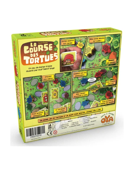 a Course des Tortues est un jeu de société passionnant où les joueurs doivent guider leur tortue (dont la couleur est tenue secrète) jusqu’à la ligne d’arrivée. Chaque joueur dispose de 5 cartes de déplacement pour déplacer les tortues sur le plateau de jeu.