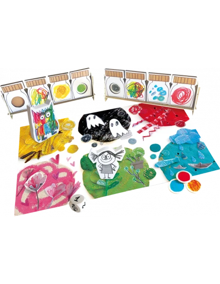 Contenu : 1 plateau de jeu, 1 jeton monstre des couleurs, 1 jeton petite fille, 1 dé, 8 jarres pour y stocker les émotions, 2 étagères pour y ranger les jarres, 5 marqueurs d’émotion.