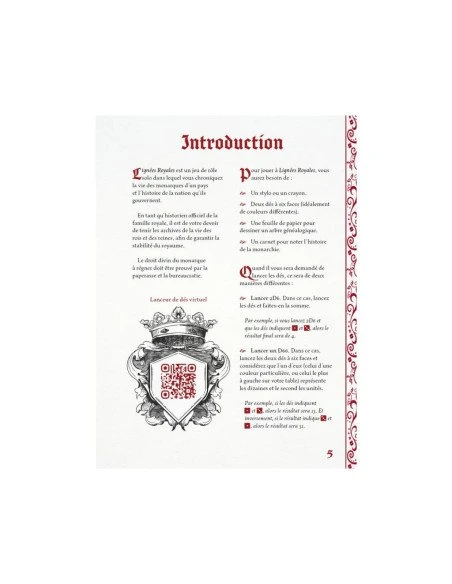 Avec seulement deux dés à 6 faces, du papier pour écrire et une imagination fertile, Lignées Royales vous permet de bâtir un royaume complexe sans nécessiter de compétences particulières en jeu de rôle. Vous créerez des dynasties, forgerez des alliances et orchestrerez des intrigues pour donner vie à un monde royal vibrant et authentique. Plongez dans un voyage narratif captivant et laissez libre cours à votre créativité pour façonner l’histoire comme jamais auparavant.