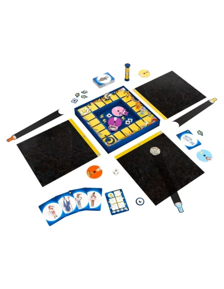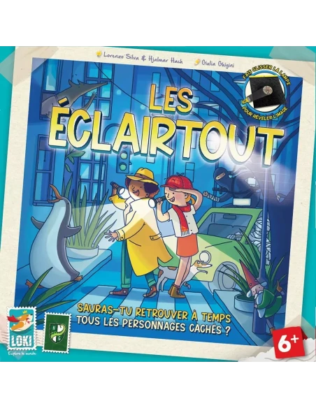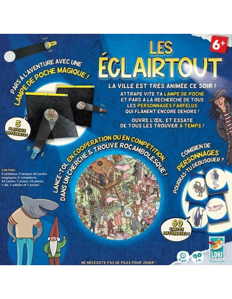 Les Éclairtout est un jeu coopératif ou compétitif d’observation conçu pour toute la famille. Armé d’une lampe de poche, chaque joueur doit découvrir des personnages amusants et mystérieux dans un monde nocturne. À chaque tour, une carte de recherche indique un personnage à repérer, et les joueurs glissent leur lampe sous leur plateau pour explorer et identifier ces personnages avant que le temps imparti ne s’écoule. Avec un plateau dynamique et un sablier, le jeu met les joueurs au défi de collecter les personnages en évitant d’être distancés par la Lune qui avance à chaque manche. Les Éclairtout combine rapidité, observation et stratégie dans une aventure immersive qui captive petits et grands.