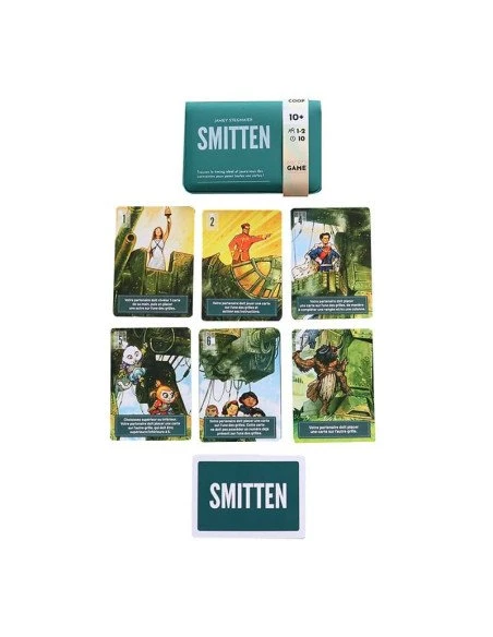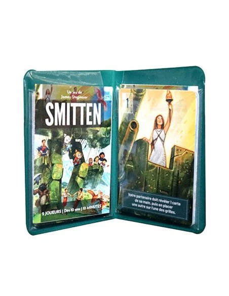 Dans Smitten, vous créez deux tableaux de 9 cartes chacun représentant les jeux édités par Stonemaier Games, joliment réillustrés par Vincent Dutrait pour l’occasion. Chaque carte a un effet unique qui se déclenche lorsque vous la posez, il vous faudra donc faire preuve de stratégie pour gérer ces effets et éviter qu’ils ne vous bloquent. Smitten est un casse-tête de tableau de cartes à effets imaginé par Jamey Stiegmaier pour célébrer les 10 ans de sa maison d’édition.