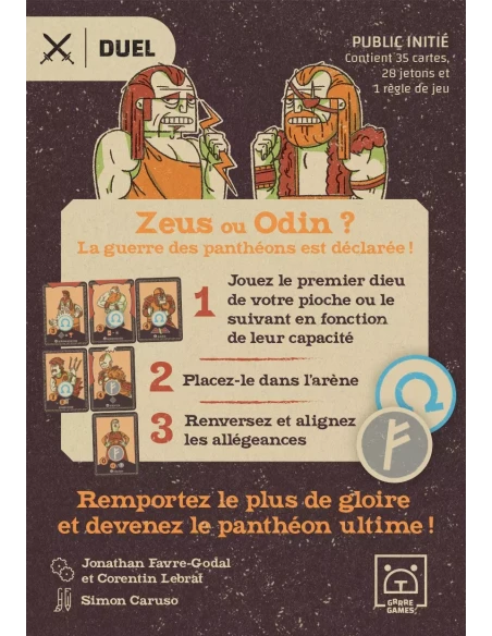 Chaque joueur contrôle son propre deck de dieux et doit placer ses cartes avec intelligence dans l’arène pour créer des alignements gagnants. Certaines cartes permettent d’inverser les allégeances, bouleversant ainsi le cours de la partie en un instant. Rapidité et réflexion sont de mise pour exploiter les meilleures combinaisons et s’assurer la gloire des dieux !