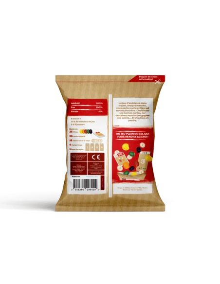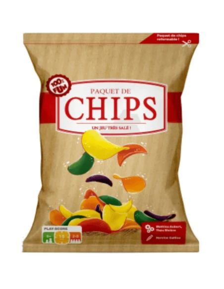 Paquet de Chips est un jeu d’ambiance amusant et divertissant où les joueurs doivent parier sur la couleur des chips piochées dans le paquet. Le but est d’accomplir des objectifs, prendre des risques et marquer des points pour gagner des jetons Récompense. Chaque partie dure environ 15 minutes et le jeu peut être joué par 2 à 5 joueurs, dès l’âge de 8 ans.