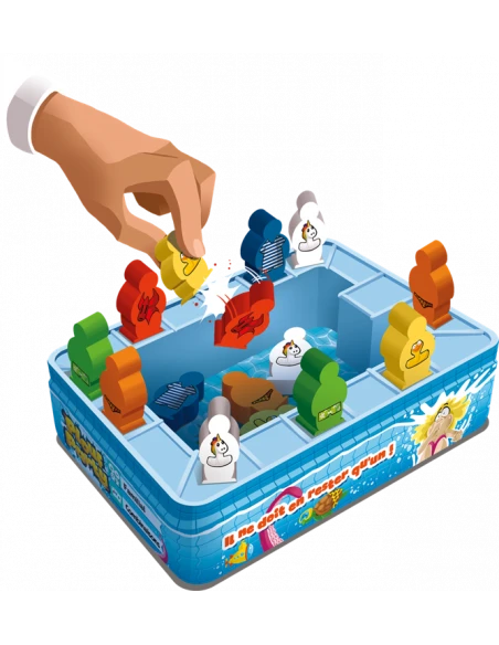 Contenu : 6 jetons, 18 pions, 1 fond de piscine, 37 autocollants, 1 règle du jeu, 1 piscine en 3D.