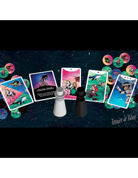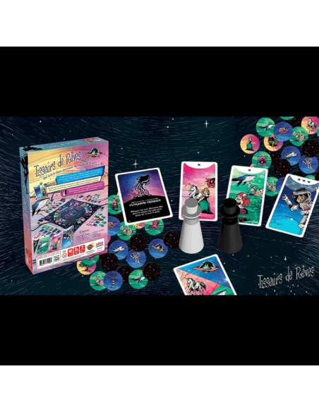 Contenu : 2 pions Tisseur de Rêve, 75 cartes Rêve, 12 cartes Objectif, 45 jetons de Sable Magique, 14 cartes Découverte, 1 tapis de jeu, Règle du jeu.